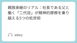 家業を継ぐ、あるいは継ぐかどうかを考え始めたとき。多くの人がまず感じるのは、期待よりも 戸惑いや不安 ではないでしょうか。私自身、父が経営する零細企業に入り、「2代目候補」という立場で働く中で、さまざまな悩みに直面してきました。このページで...